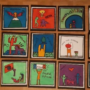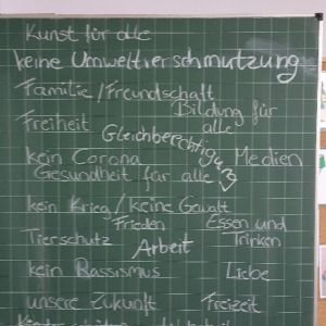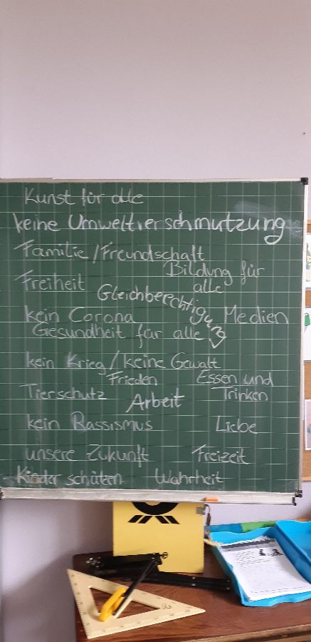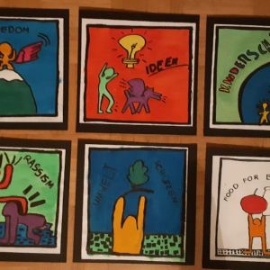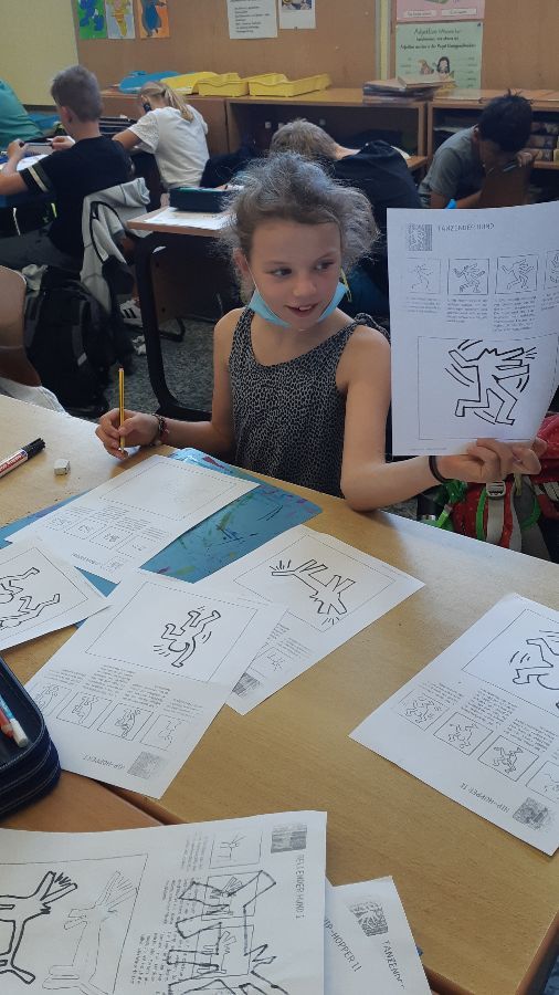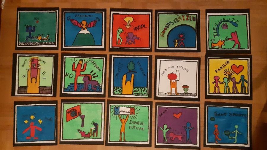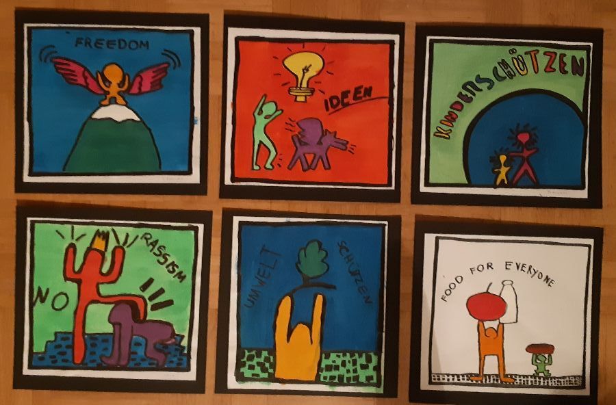 Keith Haring hat viele Figuren, wie z.B. Hunde, Menschen und Babys gemalt. Mit Anleitung haben wir probiert, wie Keith Haring zu zeichnen. Keith Haring hat auch Themen wie z.B. Rassismus, Liebe und Gesundheit mit seinen Bildern dargestellt. Dann haben wir uns eine Welt nach unseren Wünschen vorgestellt und viele Themen für unsere Bilder gesammelt, z.B. Tierschutz, Kinderschutz, keine Gewalt, Zukunft mit Medien, Essen und Trinken für alle Menschen... Die ganze Tafel war voll mit unseren Ideen.
