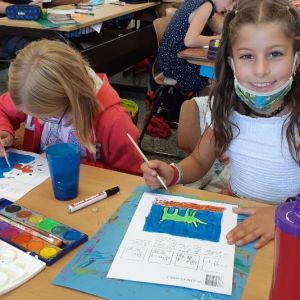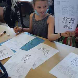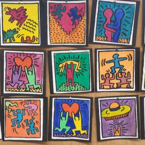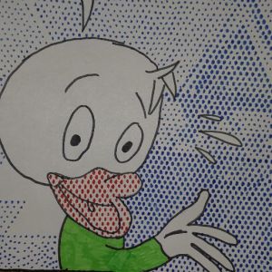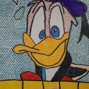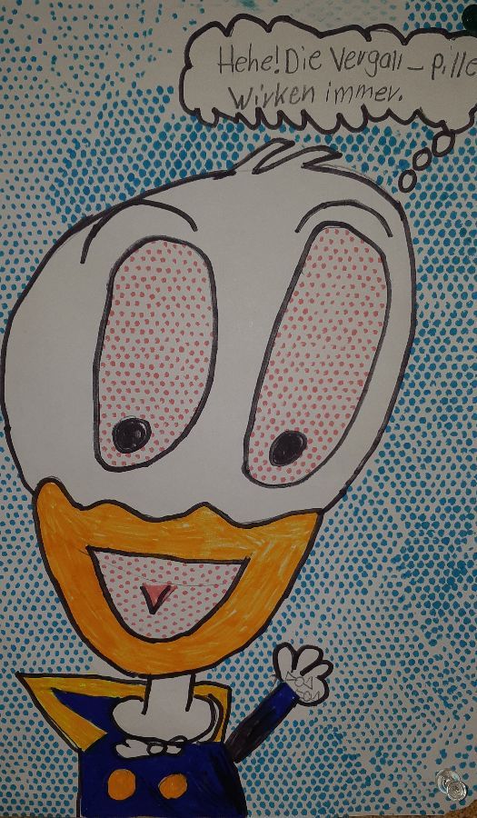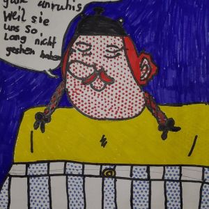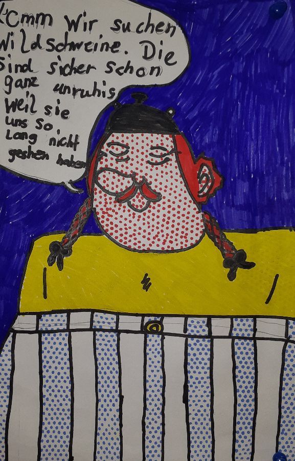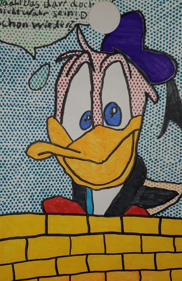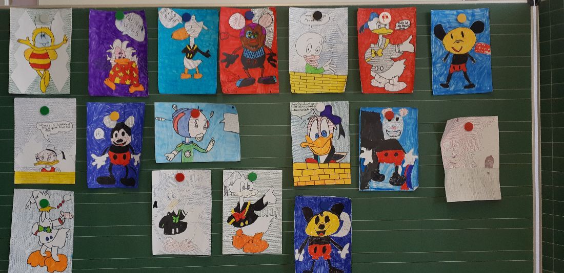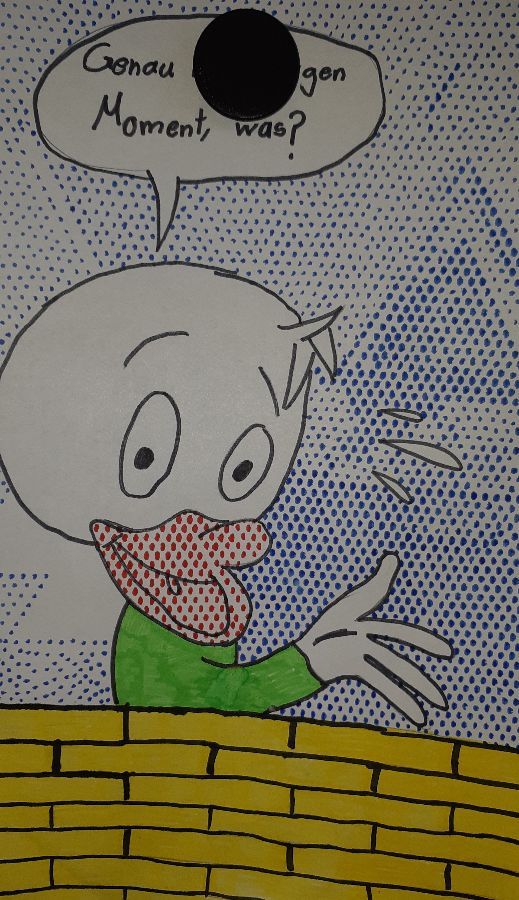 Unser Thema im Kunstunterricht ist POP-ART. Wir beschäftigen uns mit dem Künstler Keith Haring, davor haben wir uns mit Roy Lichtenstein beschäftigt. Wir haben uns Bilder von Roy Lichtenstein angeschaut und dann selber Comicfiguren gezeichnet. Für die Punkteflächen haben wir ein Gitter benutzt. Unsere Bilder sind sehr toll geworden!