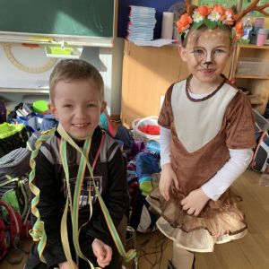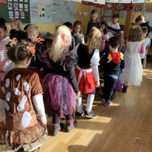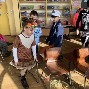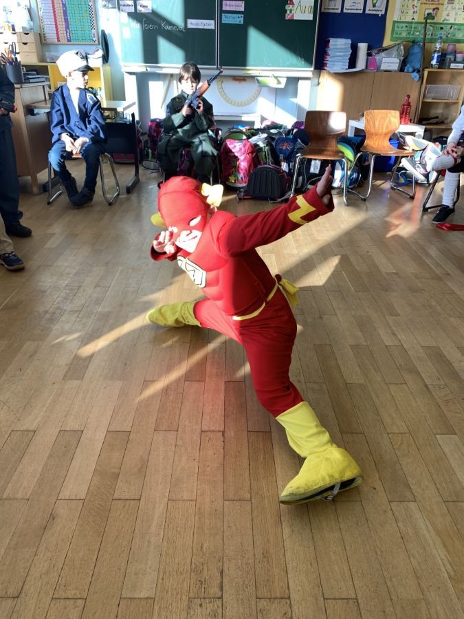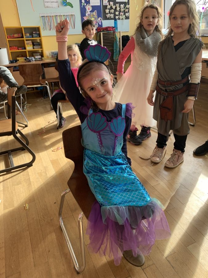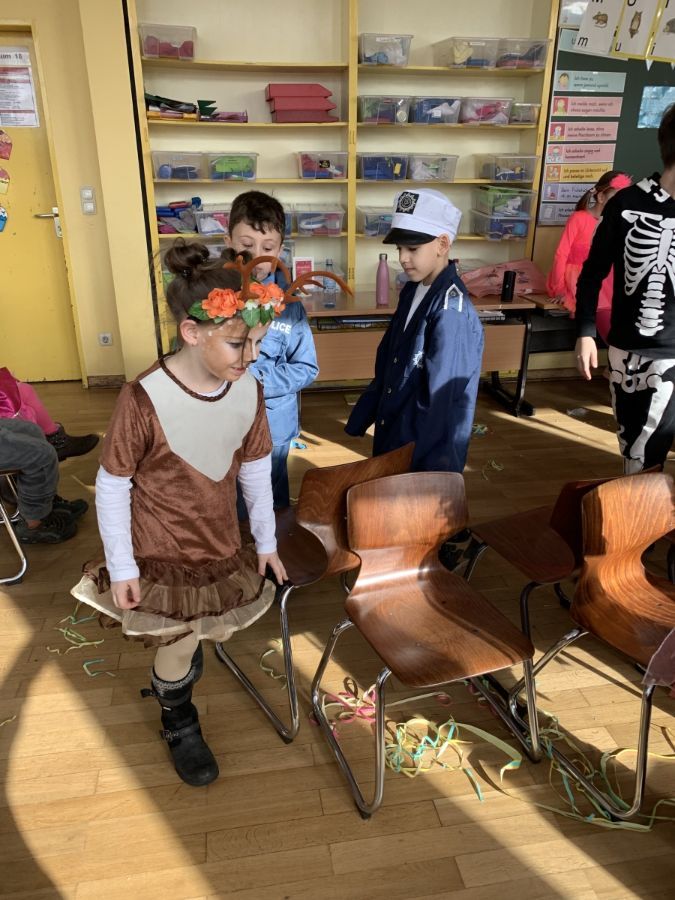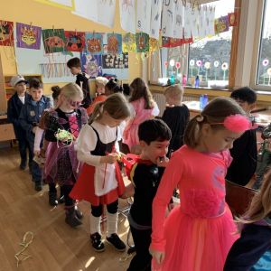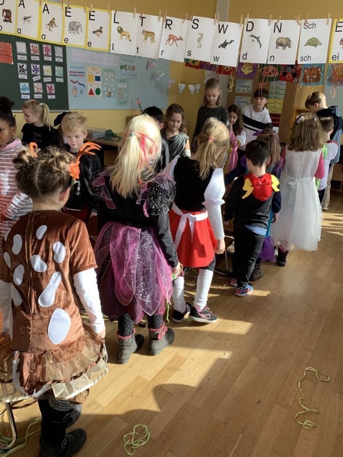 Am Freitag vor Rosenmontag feierten wir gemeinsam Karneval. Nachdem wir in der Sporthalle mit der ganzen Schule gesungen und getanzt haben, ging die Feier in der Klasse weiter. Wir stürmten zuerst das Buffet mit unseren mitgebrachten Süßigkeiten und stärkten uns für Spaß und Spiel. Die Spiele "Reise nach Jerusalem" und "Stopp-Tanzen" durften natürlich nicht fehlen. Wir hatten alle viel Spaß!