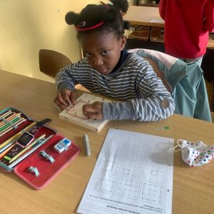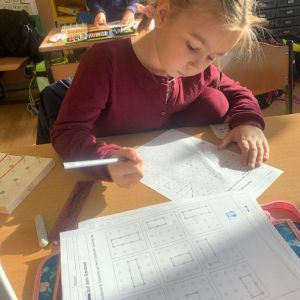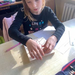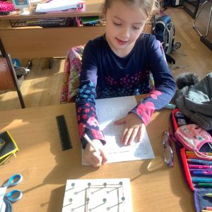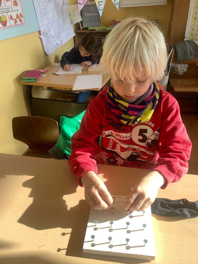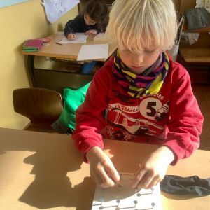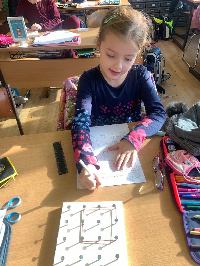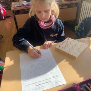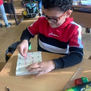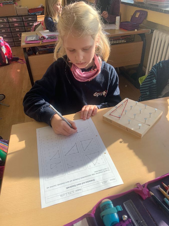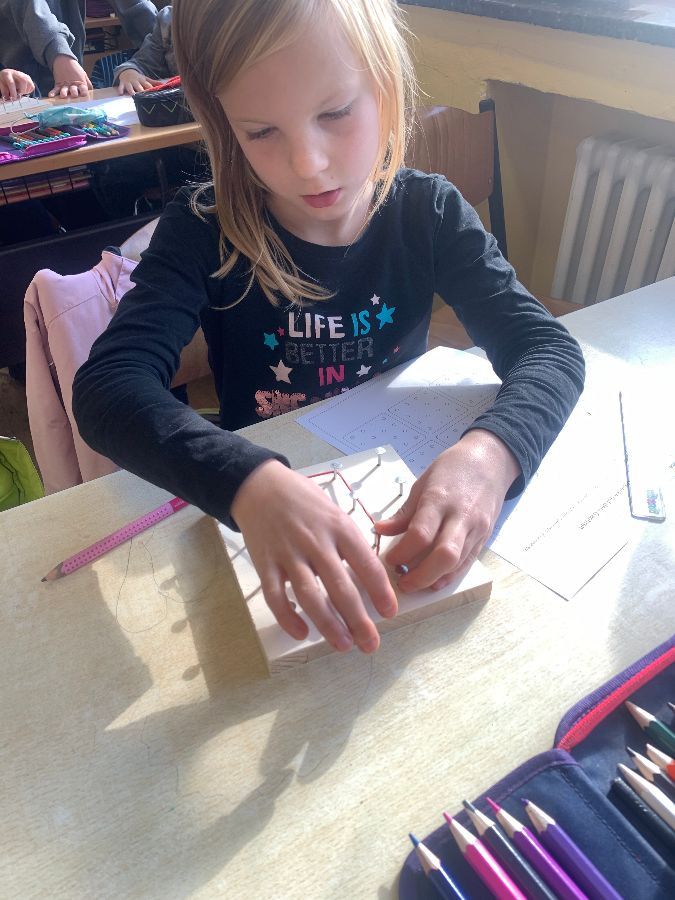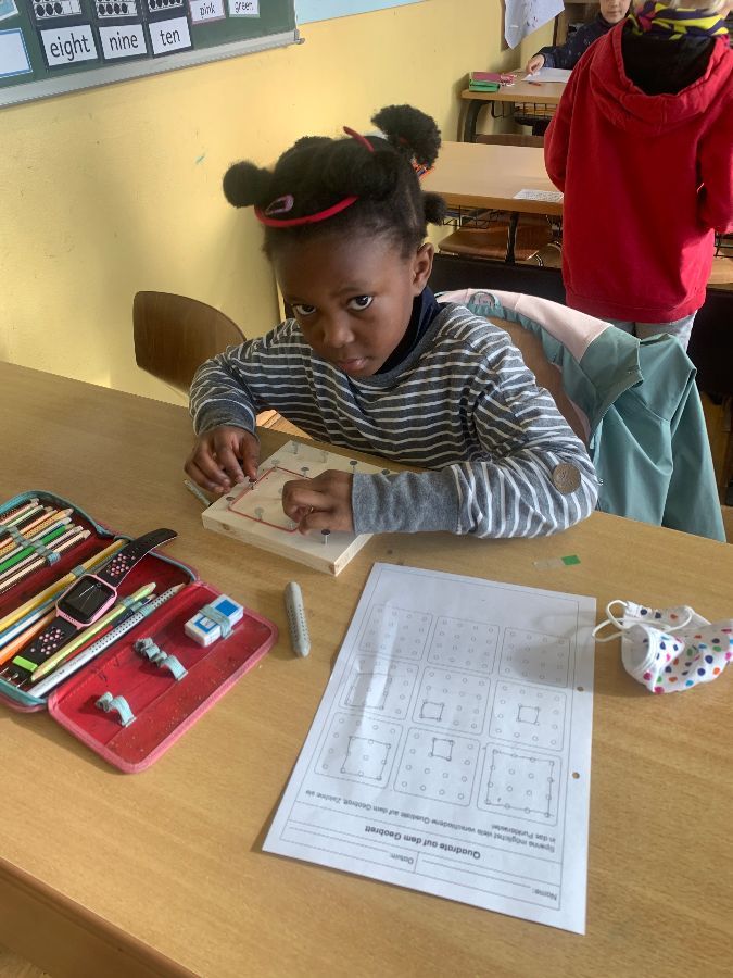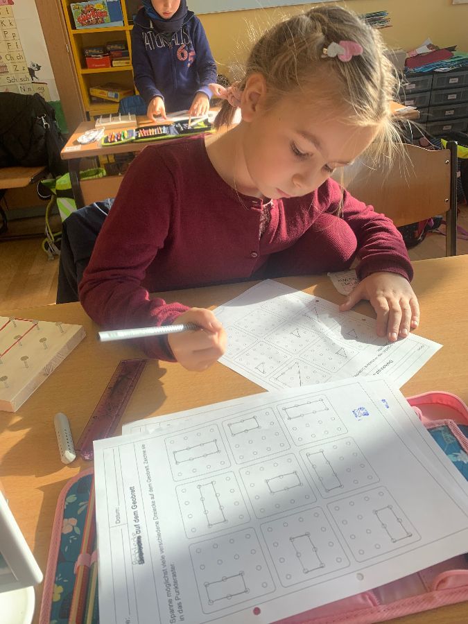 Wir haben mit Gummibändern verschiedene Figuren nachgespannt und selbst ausgedacht. Außerdem haben wir Formen gespiegelt und gezeichnet. Das Arbeiten mit den Geobrettern hat uns allen viel Spaß gemacht.